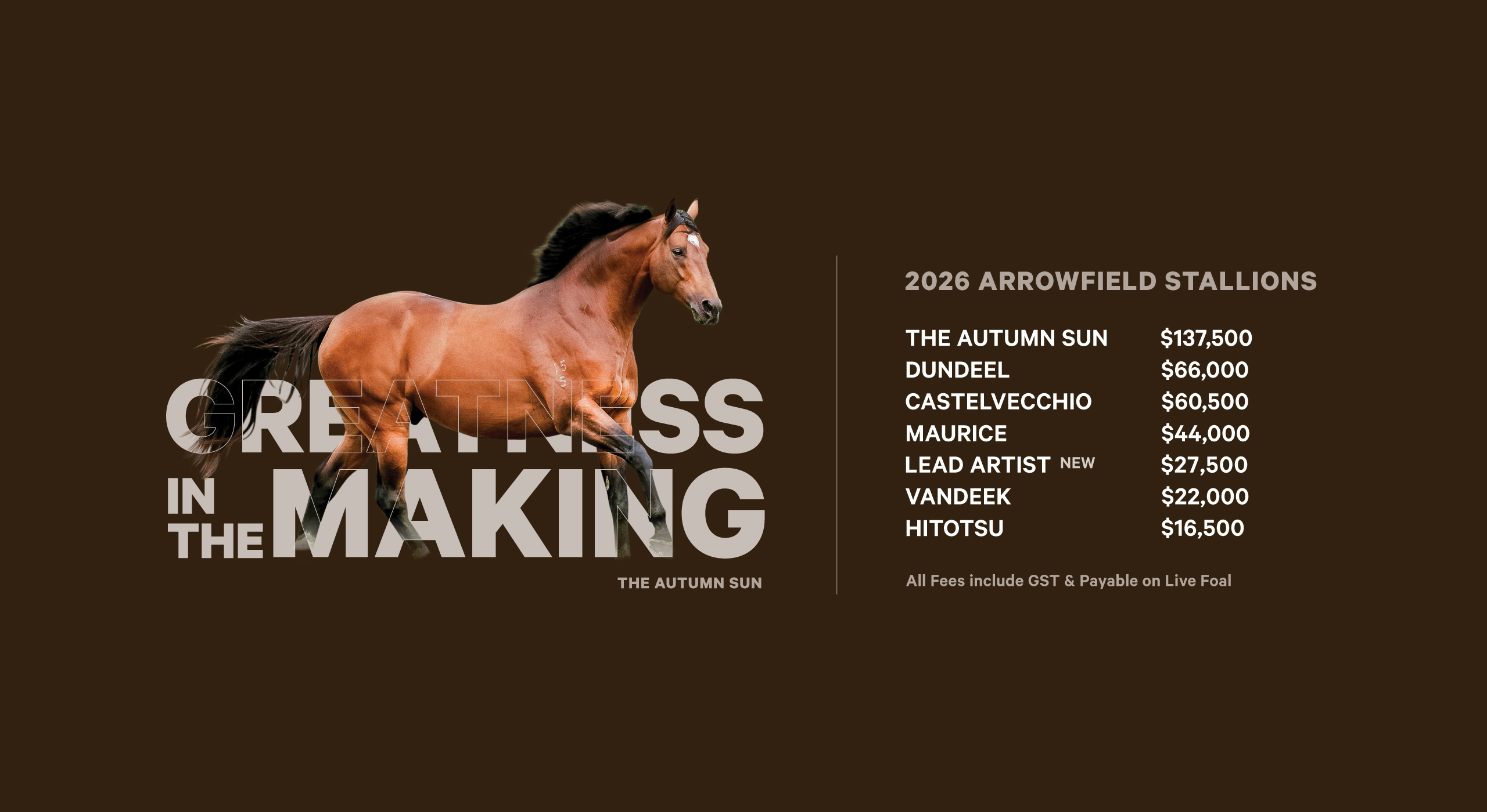 Arrowfield Stud has today announced the 2026 fees for its 7 stallions after 10 Group 1 victories by four Arrowfield sires during the Sydney Autumn Carnival...