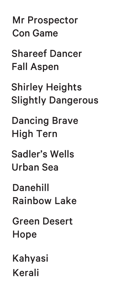 HEAT HAZE (Green Desert) 7 wins from 1300m to 1900m, €50,960, US$1,135,660, Hollywood Park Matriarch S., Gr.1, Arlington Park Beverly D S., Gr.1, Churchill Downs Citgo Distaff Turf Mile S., Gr.3, Santa Anita Las Cienegas H., Gr.3, Maisons-Laffitte Prix Coronation, L, Chantilly Prix des Fontaines, 2d Saratoga Diana H., Gr.1, Longchamp Prix du Bois Rouaud, 3d Belmont Flower Bowl S., Gr.1, Deauville Prix de la Calonne, L, 4th Breeders' Cup Filly & Mare Turf S., Gr.1. Dam of-